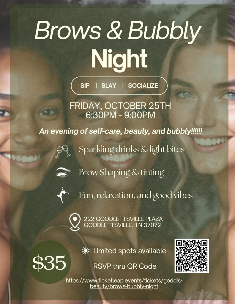 Brows & Bubbly Night 🥂✨ An evening of beauty, self-care, and connection! Join us on Friday, October 25th from 6:30–9:00 PM for our signature Brows & Bubbly Night from Goddis Beauty Garden.