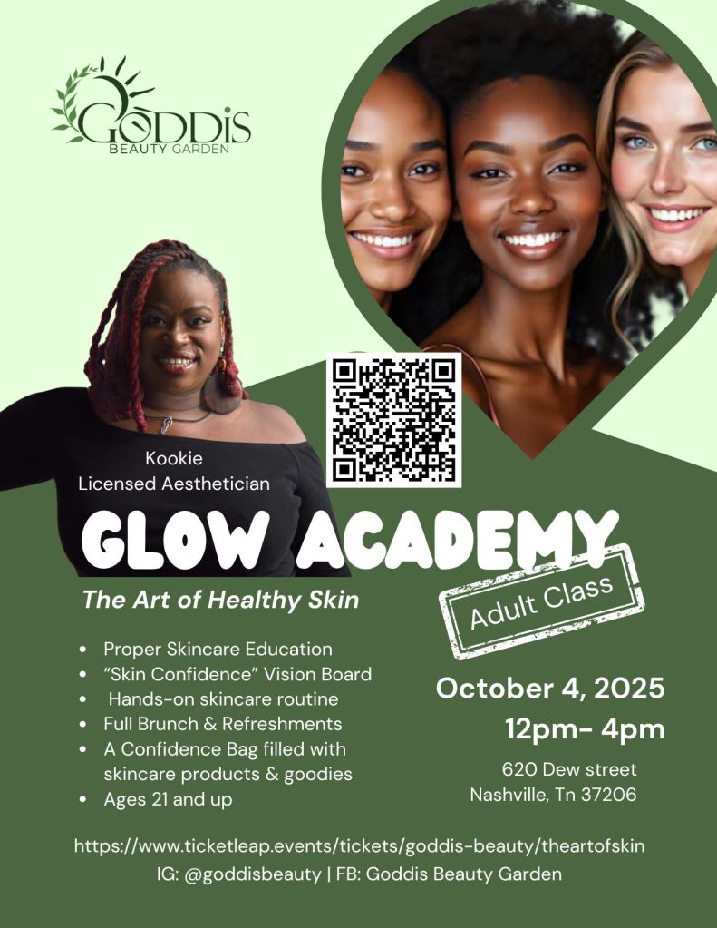 ✨ Skin Confidence: A Teen Skincare Workshop ✨ Join us for a fun and informative self-care experience! On Saturday, November 8th, 2025, at 10:30 AM, your teen is invited to 2131 26th North Ave, Nashville, TN 37208 to build more self-love, confidence and learn skincare essentials. Led by yours truly expert skincare educator, Kookie, this in-person workshop will cover: 💆♀️ The importance of a proper skincare regimen. 🌱 How to nurture and care for your skin. 💖 The power of positive affirmations in your skincare journey. Attendees will also get hands-on experience with various skincare products and discover what works best for their unique skin type. Don’t miss this opportunity to prioritize self-care, gain valuable skincare knowledge, and embrace your natural glow! Secure your spot today for the Skin Confidence: A Teen Skincare Workshop!